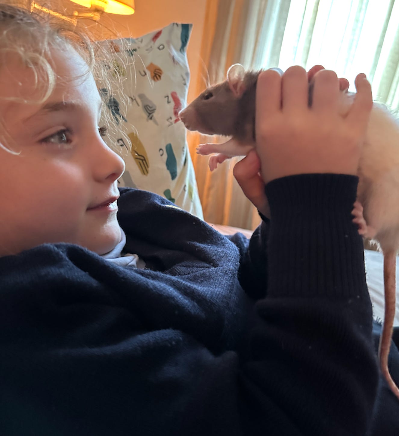 I feel that I should remark here that we lost our most beloved rat Flower yesterday. She passed away peacefully on my chest, having been loved every moment that she was with us. I knew that her passing was imminent as she had chronic respiratory infection that she struggled with since we got her. She was Fern’s favourite, and I was very scared to tell her yesterday that she had passed. But she took it well, simply asking that we name a new rat Flower in her memory. I will still expect her at the cage door, the first to be let out and the first to rip a piece of pizza out of my hands. She would always lick my lips, giving me a little kiss, and she loved to play with the dog. She was the singular rat that would eat a snack right where she was handed it, and she especially loved Froot Loops. May her memory be a blessing and may she rest in peace.