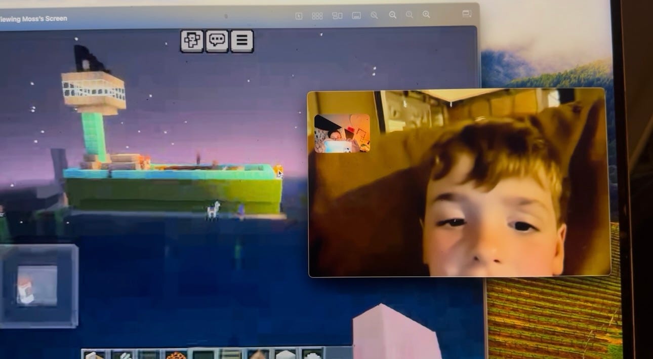 I can't imagine not having this lifeline to my kids while they are out of my grasp. They love to report on what they have been up to, and Moss loves sharing that his cat Archer is sleeping on his bed. We ask ChatGPT to help us find free things in the Minecraft Marketplace for us to try out. He shares his screen and shows me the new things that he has built while we are apart.