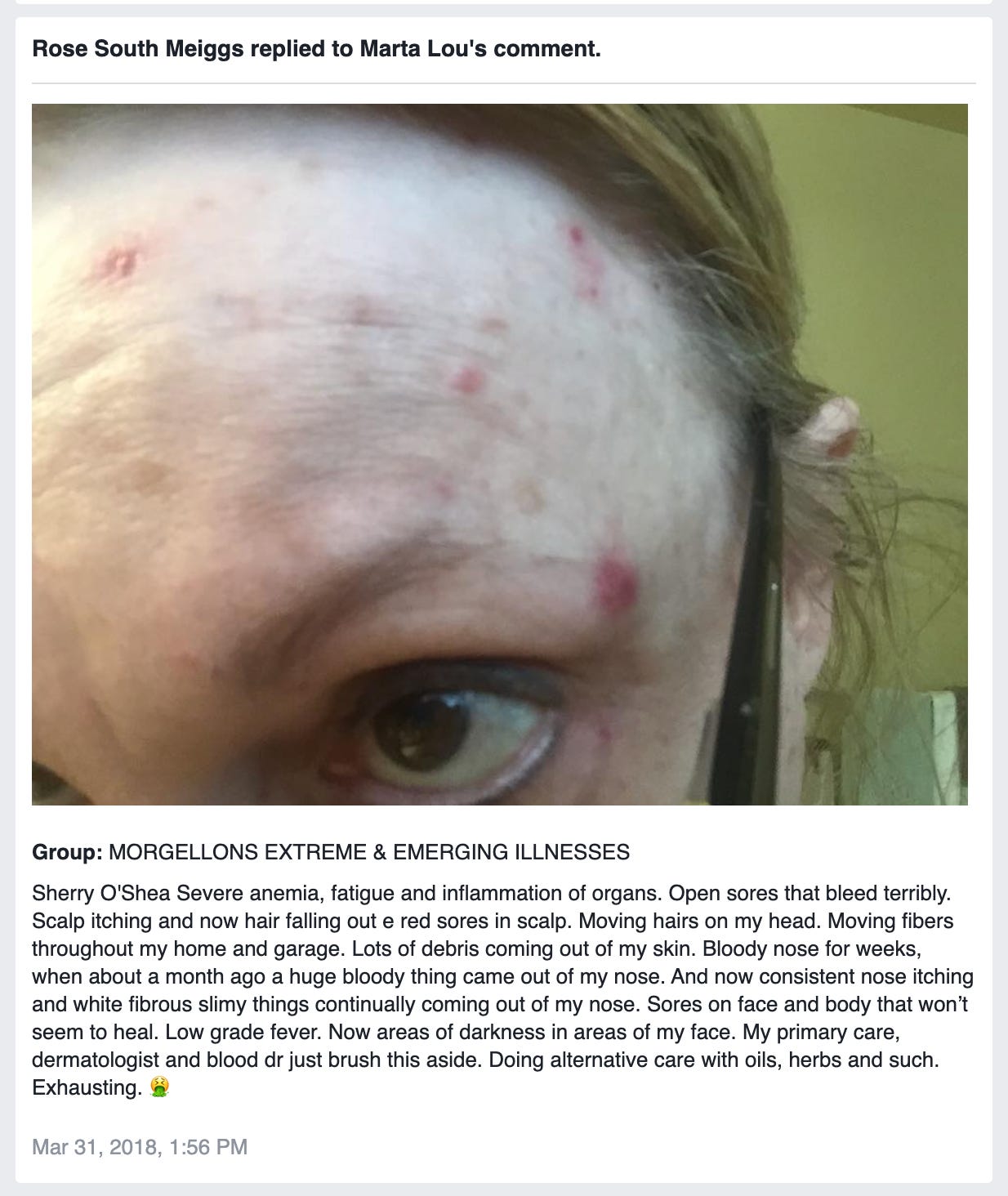 Spent the afternoon going through the archive of my mom's Facebook page and tracking her rapid decent into total madness prior to her death. In January of 2018 she joined Facebook groups related to something called Morgellon's Disease that she became convinced that she had, after originally thinking she had Lyme's disease. From there she began identifying with the diagnosis of Morgellon's more and more, posting photos in comments of things that she had 'detoxed' out of the skin of her body, sharing which essential oils will "pull the demons" out of someone's body, posting protocols for bathing in hydrogen peroxide and using it internally.